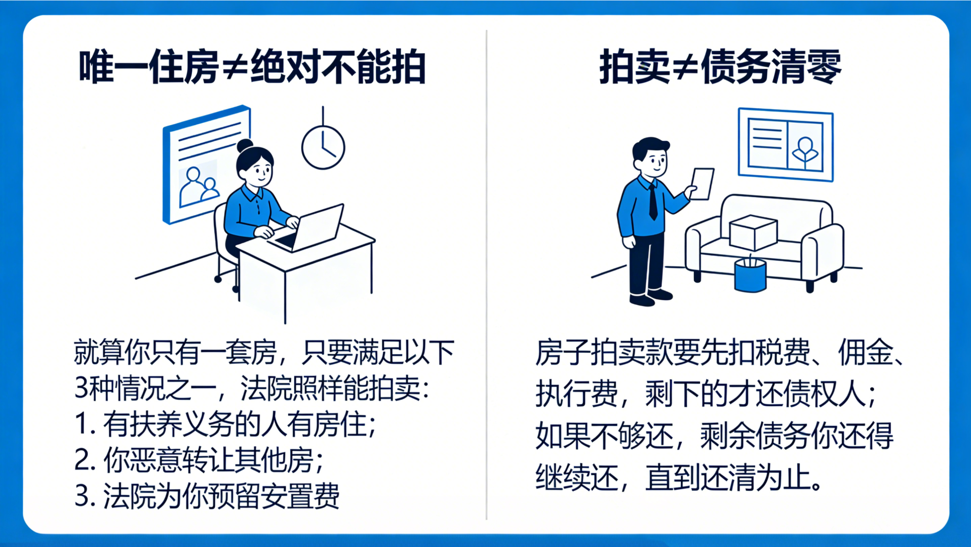 一、先掰正:「欠账」和「收房拍卖」完全不是一回事欠账只是债务关系成立,比如房贷、民间借贷没还,这只是民事纠纷,法院不会直接收房。