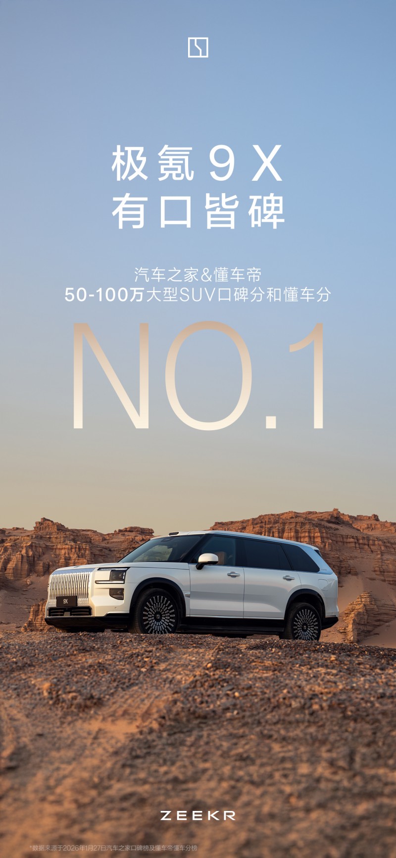 旗舰SUV极氪9X去年9月底上市以来,市场热度持续走高,在2025年11-12月连续2个月获得50万级大型SUV销量冠军,连续3个月稳居杰兰路50万元以上SUV性价比榜首,汽车之家&懂车帝50-100万大型SUV口碑分和懂车分第一,持续引领50万级豪华新能源SUV市场。