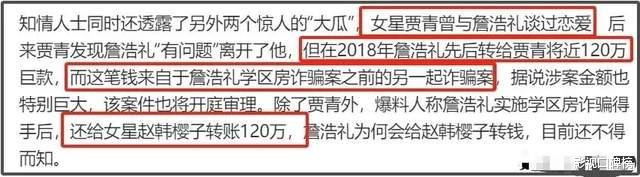 也有传闻,詹浩礼与贾青曾经相恋过,还给赵樱子转了120万。