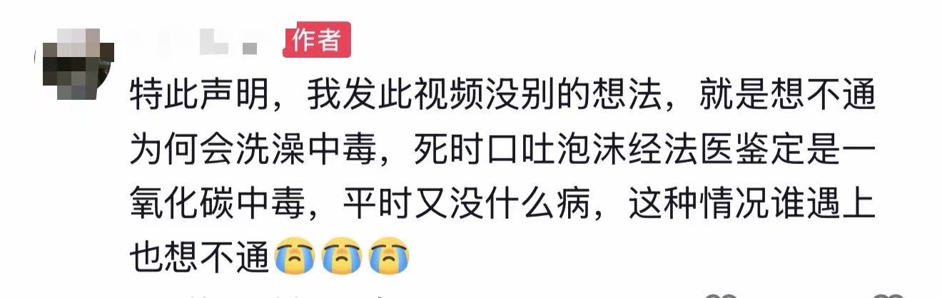 该女士在评论区回应,称自己之所以发布视频是因为自己想不通儿子为什么会洗澡时中毒,而且当时口吐白沫,经过法医鉴定才确定了死因,直到现在她还是不明白到底哪个环节出了问题。