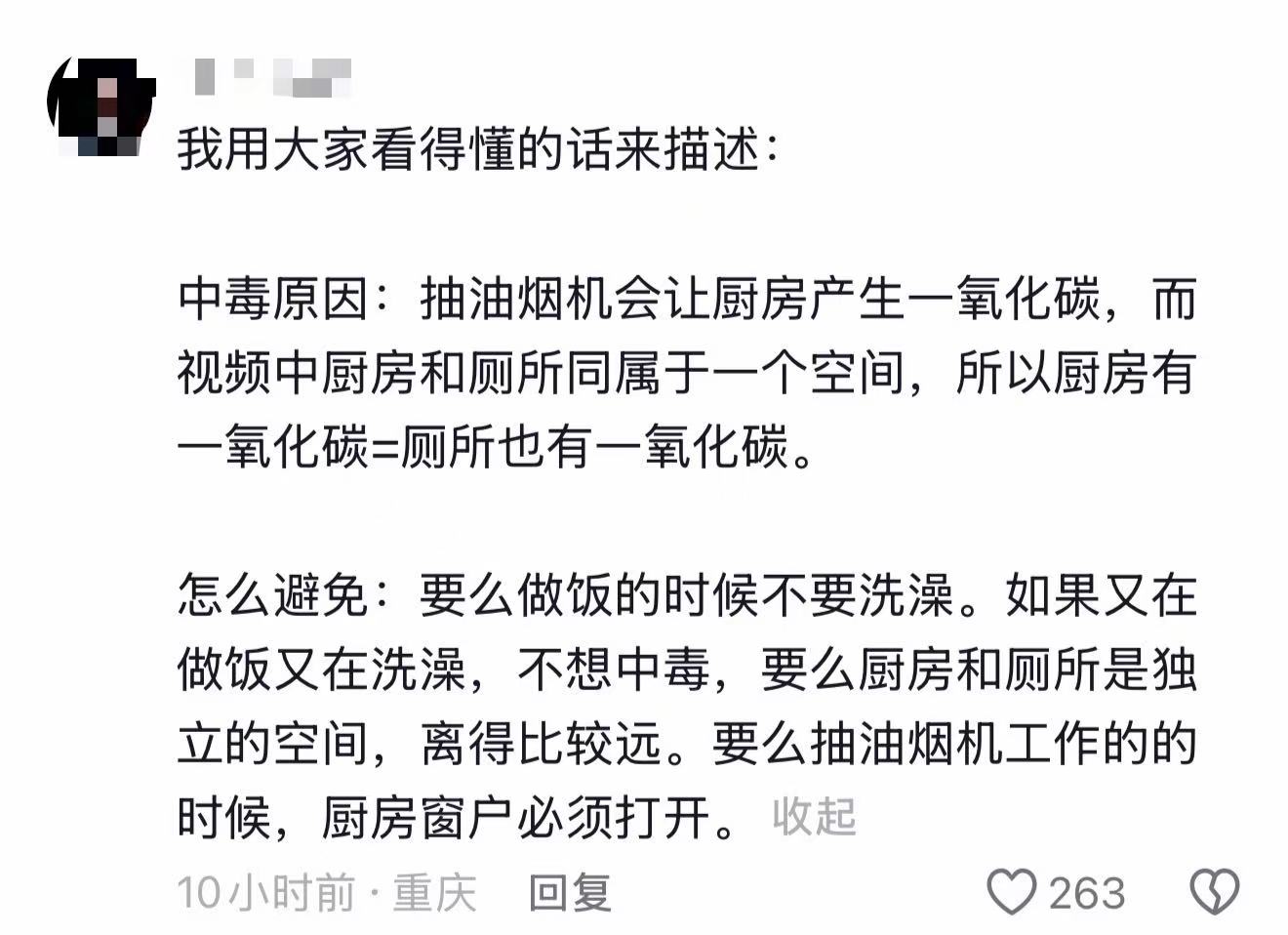 评论区有网友提到,她犯了一个错误,或许她自己都没有意识到:如果在家中安装了功率大的油烟机,厨房密封性好的,做饭的时候家里刚好有人在洗澡,油烟机能把真空抽走,燃气热水器释放一氧化碳,加上水蒸气,人能在五秒内失去意识,从而导致意外发生。