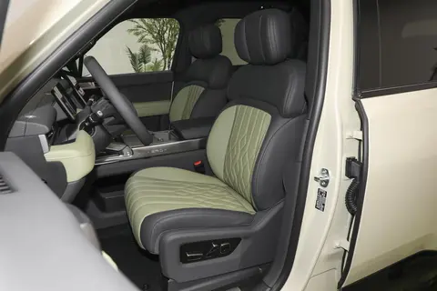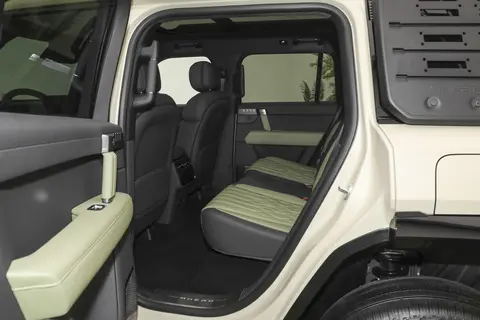 坐进车内,直观感受是和传统硬派越野不太一样。黑配暗绿的“迎松墨”内饰配色稳当不沉闷,全车近92%都是软包,顶棚和后备厢用的绒质面料,不像老款越野车那样到处是硌手的硬塑料。驾驶舱里的小设计也贴心,方向盘旁的飞航旋钮像潜水表,转动阻尼适中,切换驾驶模式顺手;金属门把手握感扎实,关车门时“咔嗒”的机械声透着可靠。车顶有组带6个AUX开关的飞航拨杆,都是预留电源接口,后期加射灯、对讲机方便,玩改装的人会喜欢。金属按键按下时,氛围灯会跟着呼吸闪烁,晚上开车看着像小星光,不花哨但有韵味。
