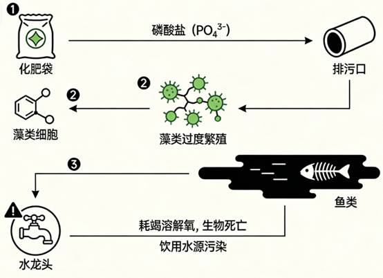 导致藻类过度繁殖,降低水体透明度,形成 “水华”“赤潮”;