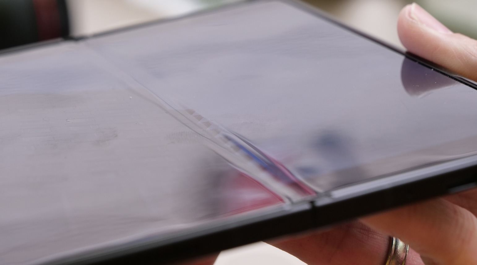其二,是铰链底座的 “铺不平” 困境:传统铰链由数百个微零件拼装,表面起伏最高达 0.2 毫米,是折痕深度的 3 到 5 倍,而屏幕的反弹应力会让不平整的底座进一步放大折痕。两大物理法则交织,让折痕成为折叠屏行业难以逾越的技术鸿沟,即便是拥有顶尖供应链的巨头,也只能在视觉层面寻求折中方案。