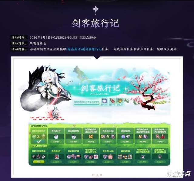 从今天开始至3月31日,玩家使用莲参与“剑客旅行记”活动,完成每周任务与步步高任务即可获得丰厚的成长资源,加速等级提升。同时,新版本对多项游戏系统进行了优化,让新老玩家都能轻松享受冒险乐趣。