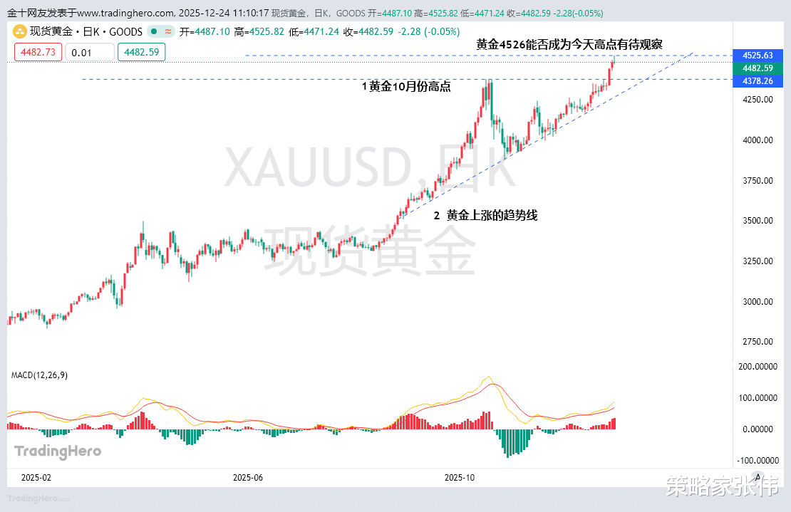 黄金要继续上涨一波,而且大概率要继续破位新高,至于涨到哪里停止,没有人知道,我们在10月份就预测黄金在2025年有望到达4500的位置,目前已经到达,并且站上了4500最高触及4526一线。