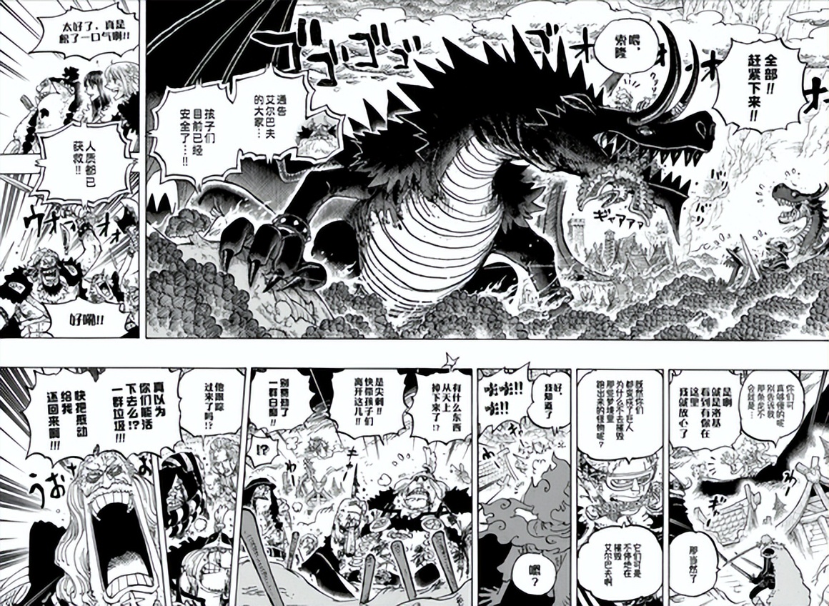 本周海贼王漫画1175话已经更新,本话标题为雷龙。扉页则是萨博和克拉尔,萨博照顾小考拉,克拉尔陪考拉爸爸喝茶!