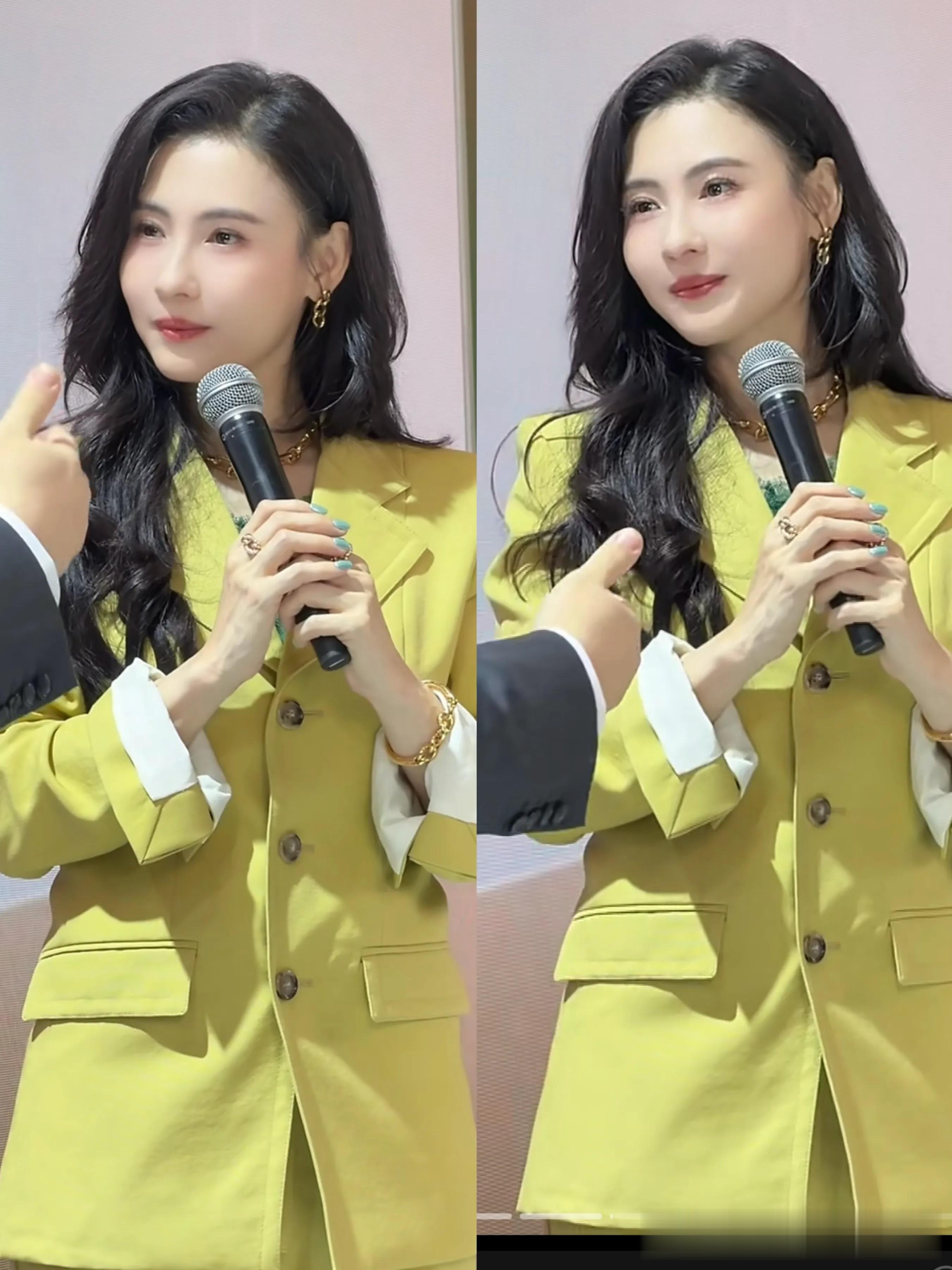 今晚的她,身穿一套黄绿色休闲西装,挺括的裁剪,让她看上去特别挺拔,春意盎然的,特别有活力!