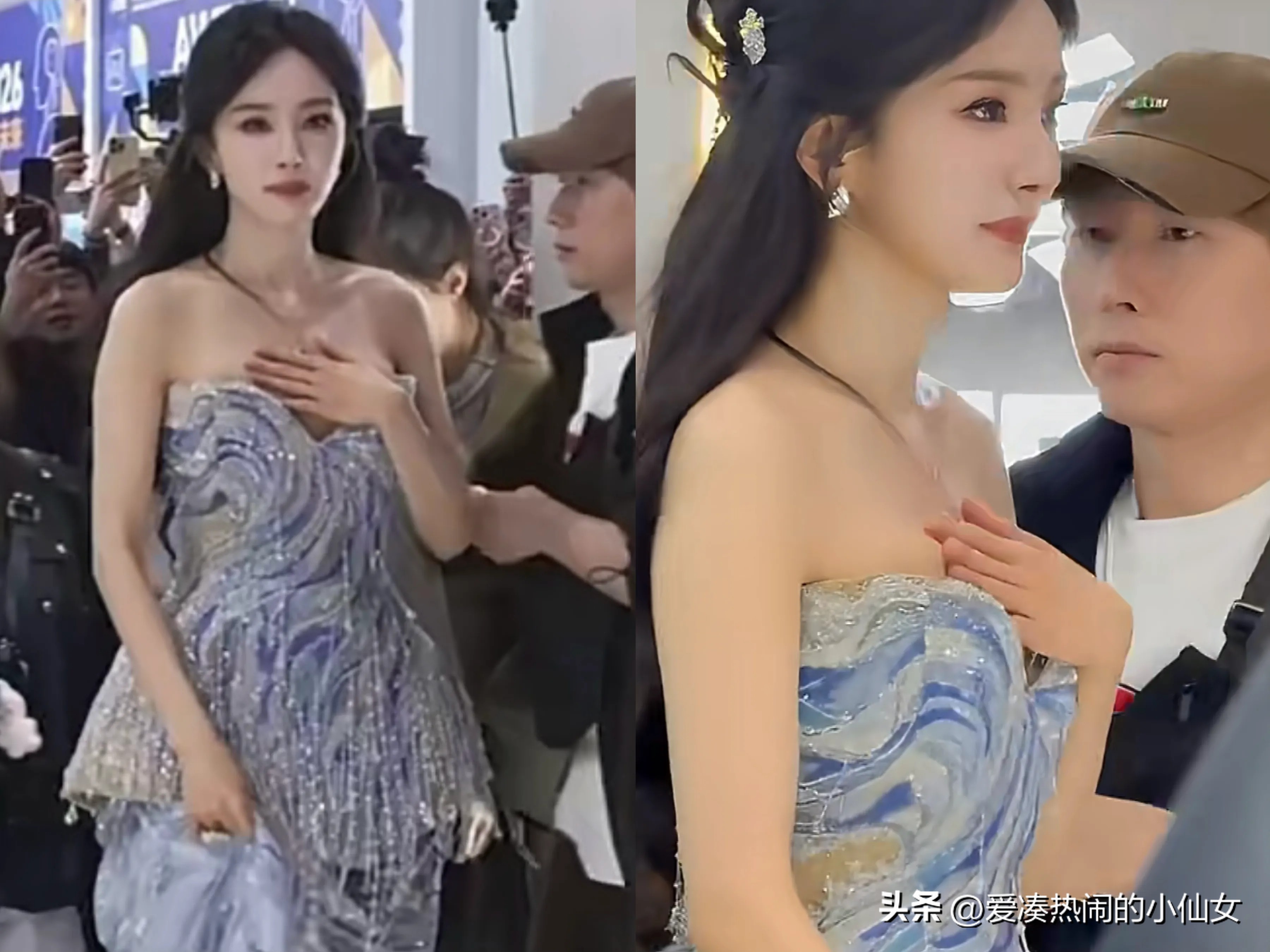 可能是衣服的原因,杨幂明显得有点不太自在,时不时地捂住胸口。