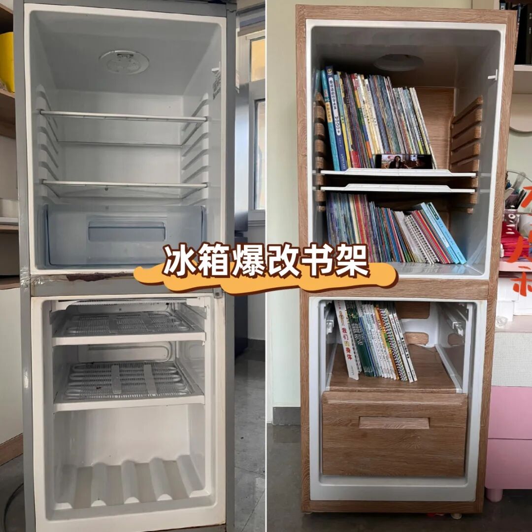 老家淘汰的旧冰箱,坏了修不好,放在家里占地方,直接扔了又太可惜,简单改造一下,就能变身大容量书柜,完美解决家里书、玩具没地方放的难题。