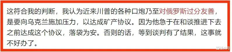 在另一边,川普也表示两国即将签署自然资源协议,这对美国来说是一个非常好的交易,对乌克兰也有利。外网有博主称,在这件事情上,普京被川普当枪使了,对此我深以为然。