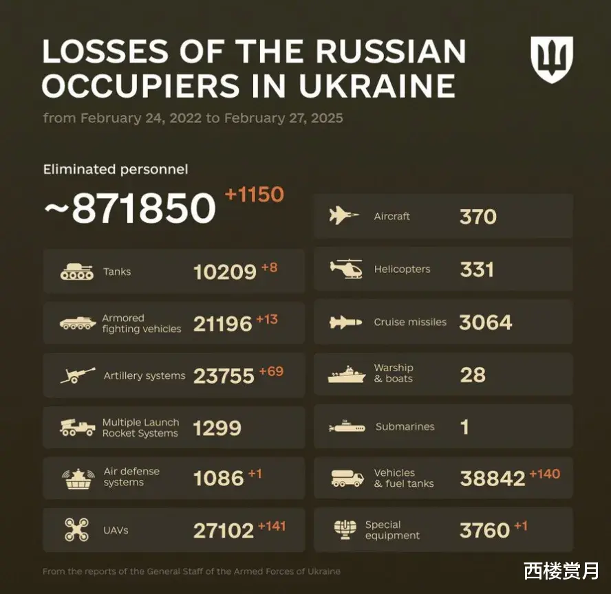 乌总参公布的昨日战果,歼敌(毙+伤)1150人,俄军伤亡达到了871850人,在乌军的2倍以上。。