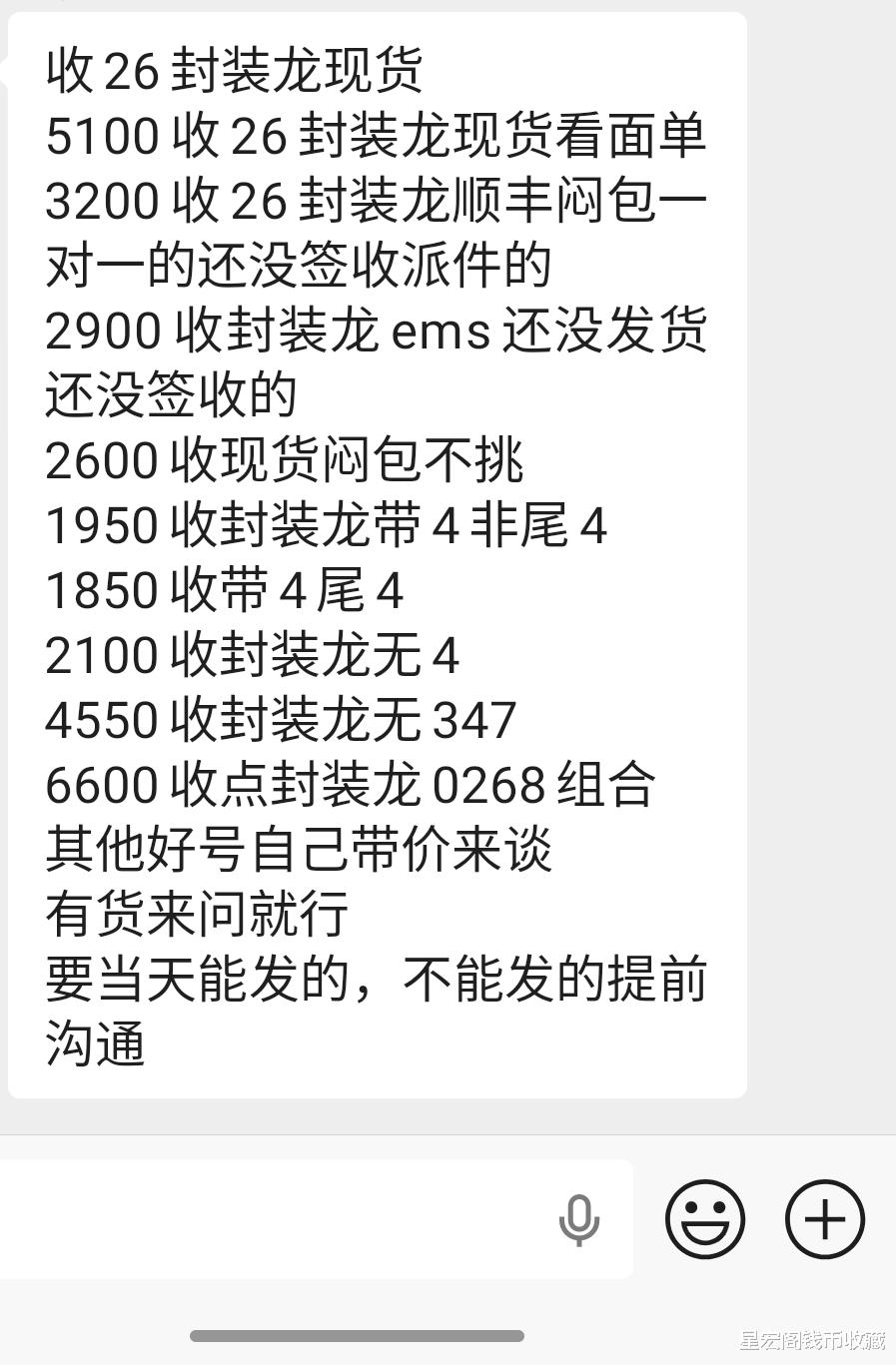 同时部分币商也是在收购2026版中国龙银币封装纪念版现货闷包,价格从3800~5100元左右都有出现,不过这么高价格收购2026版中国龙银币封装纪念版闷包有先提条件,要看快递面单才能确认最终的收购价格。
