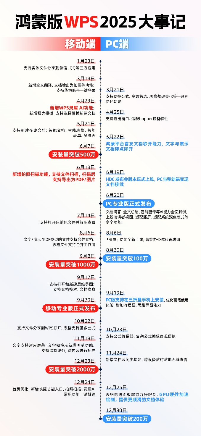 这些一点一滴的改进,让鸿蒙版WPS成为了很多人日常办公的必备工具。一个直接的数据是,2025年鸿蒙版WPS在移动端的累计安装设备数一路攀升超过了2000万,目前甚至达到了3000多万。这不仅仅是数字的增长,更意味着大家对鸿蒙版WPS的认可。
