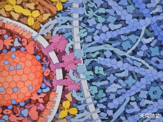 图:一幅艾滋病病毒(左)附着在细胞上的示意图