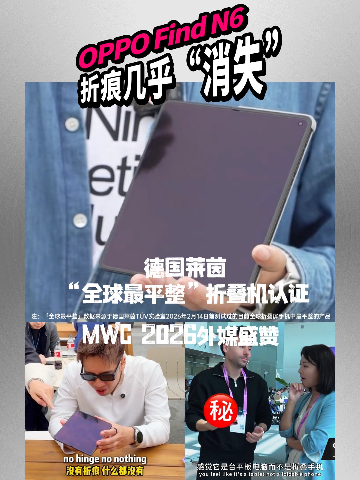 折痕焦虑?这次几乎“消失”:在行业首发“无痕钛合金铰链+自修复记忆玻璃” 这对王炸组合下,OPPO Find N6的折痕把控、屏幕平整度直接干到了新高度,最近在MWC 2026上可谓圈粉了外媒无数,综合屏幕观感表现还拿下了德国莱茵“全球最平整”折叠机认证,这含金量无需多言。