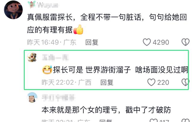 雷探长的这一回应也受到了很多网友的赞许,并送其外号“世界游街溜子”,结合这一情况来分析,这一外号是褒义的。古人云:恶人自有恶人磨,面对不同的情况,转变态度才是立于不败之地的根本。