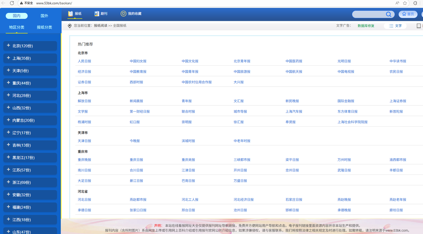 4、多媒体数字报纸这是一个在线浏览国内外各地报刊的网站,里面的内容每天都会更新,有国内和国外两个分类,还能根据地区和报纸类型进行细分,点击其中一个就能看到对应的报纸内容了。并且点击报纸的对应位置,还能看到电子版的内容,方便我们阅读和复制分享。在这个碎片化的信息时间静下心来读一份报纸,在重温之前那个深度阅读的乐趣。