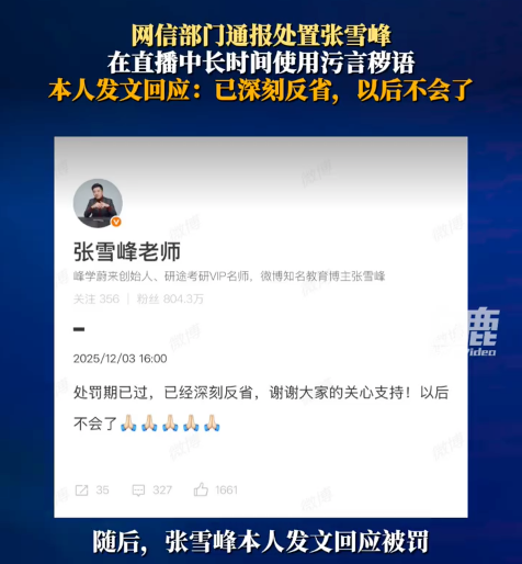 这事儿说来挺有意思。12月3日,#张雪峰称已经深刻反省# 和 #张雪峰说以后不会了# 刷屏了。网信部门的通报直指其直播“长时间使用污言秽语”的违规行为。
