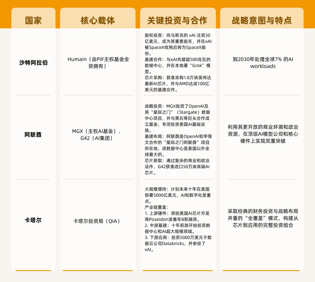·“基建绑生态”,海湾国家通过购买美国算力芯片自建数据中心,部署Grok等基础大模型,以此构建覆盖上下游的完整AI生态链。