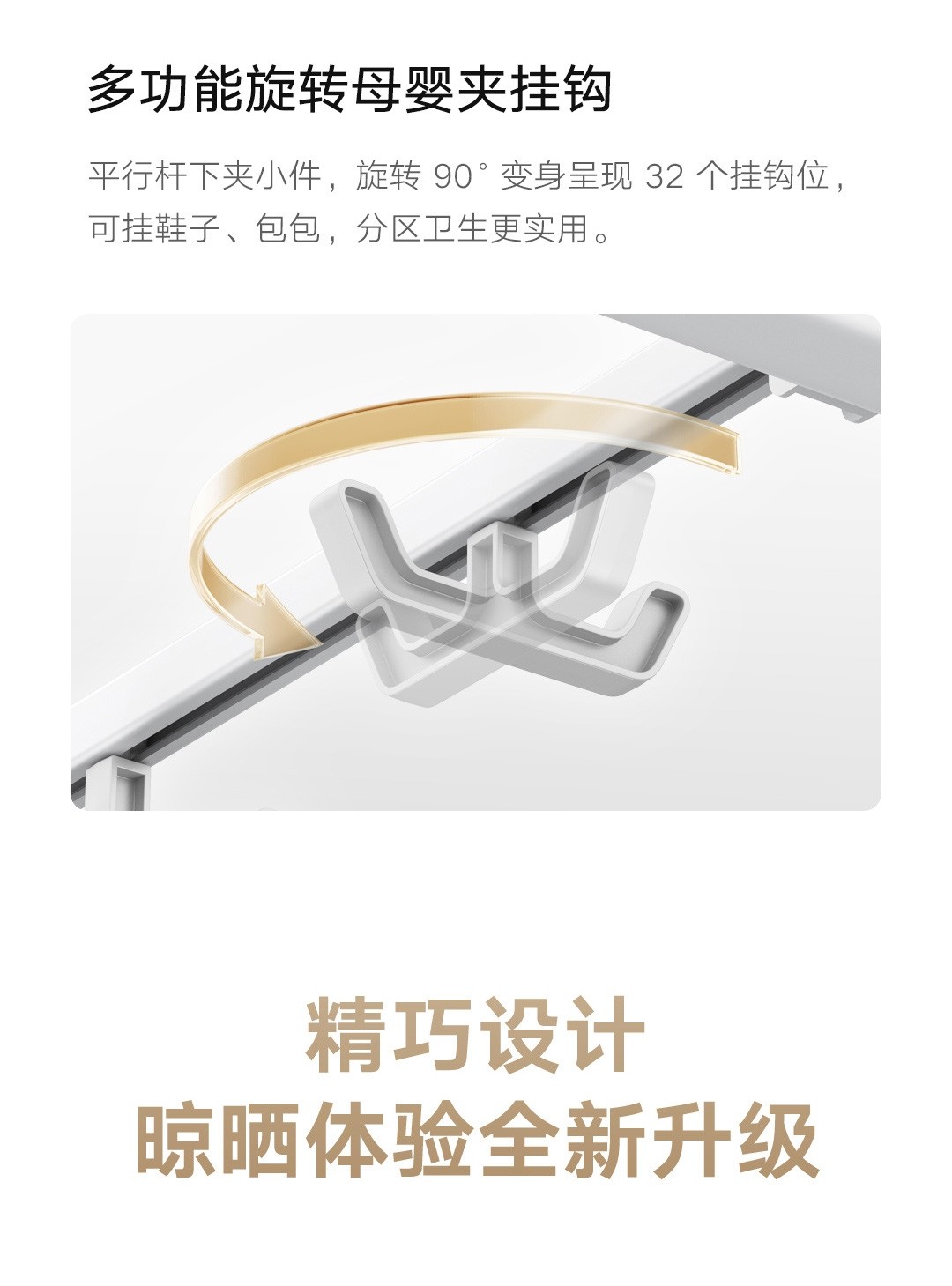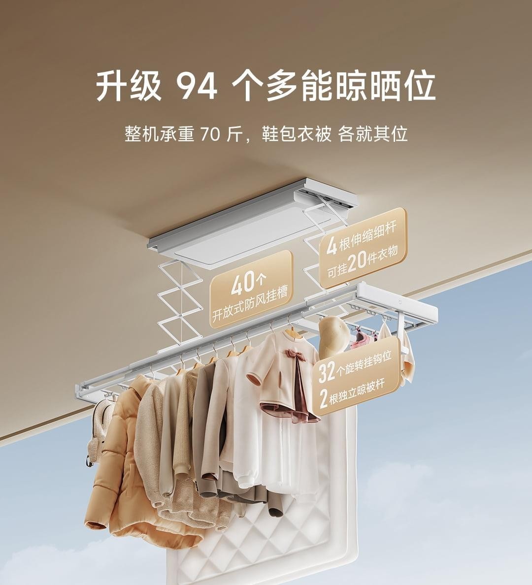 40个防风挂槽晾晒位,32个母婴挂钩夹,4根可伸缩细杆提供更多晾晒位,还有2根独立的晾被杆,方便晾晒大件被褥。