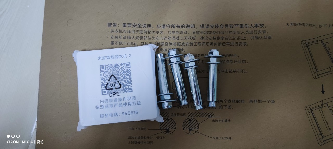 里面的东西也很简单,晾衣机主体,打孔纸板,遥控器,膨胀螺栓,说明书。