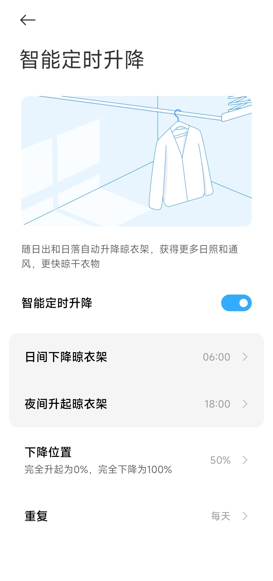米家智能晾衣机2代不仅仅在结构上做了升级,还在智能化方面增加了新的功能,智能定时升降功能可以设置在白天将晾衣机降下,获得更多日照,在夜晚升起晾衣机,追着最后一缕夕阳。