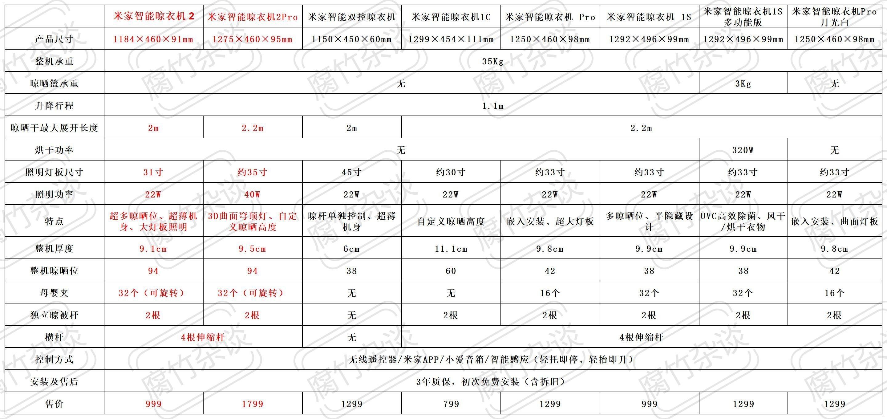下面我们看一下目前仍然在售的几款米家晾衣机的参数对比
