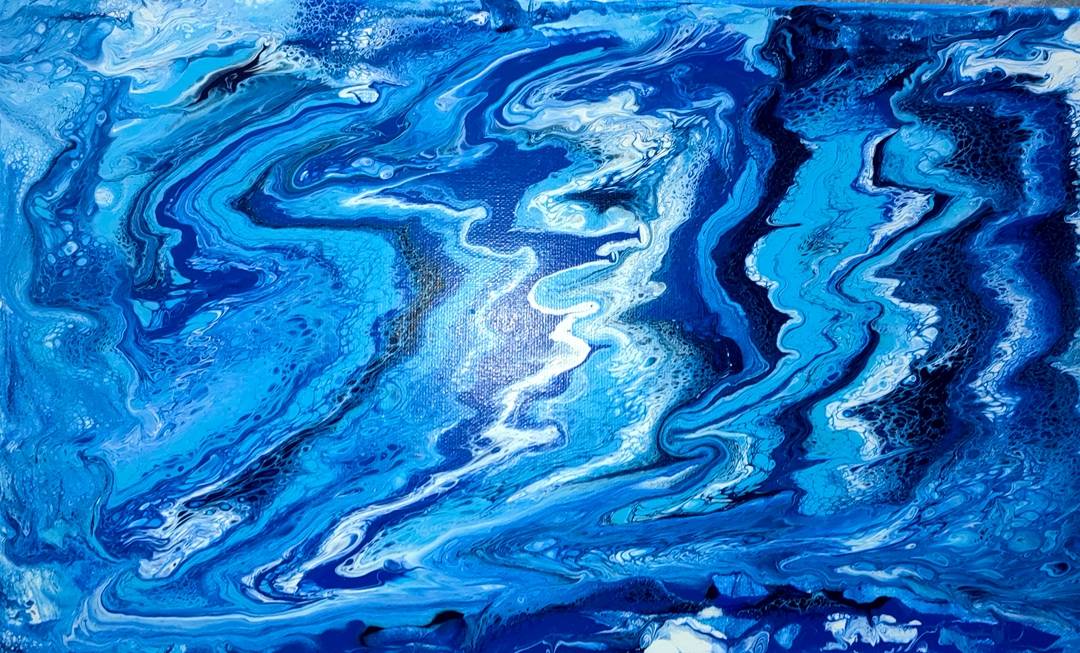 画面中,深邃的钴蓝与靛青构成基底,如同深海之下的静谧与神秘,沉淀着时间的厚重;局部泼洒的靛青与湖蓝,在明暗交织中形成流动的光感,模拟着海水折射阳光的粼粼波光,是海洋鲜活的呼吸。而偶尔穿插的乳白与银灰,并非简单的浪花复刻——它们以细碎的笔触、朦胧的晕染,时而如雾霭笼罩的海面,时而如泡沫消散的瞬间,赋予画面虚实相生的诗意。