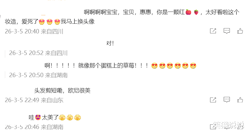 粉丝们在看到尹恩惠的新造型时,不少人表示很喜欢她这个造型,这个造型给人一种很鲜艳的活力感。有网友评价表示尹恩惠的这个草莓色服装造型,就像是她晒出的巧克力蛋糕上的草莓一样可爱,有一种甜美俏皮的气质。