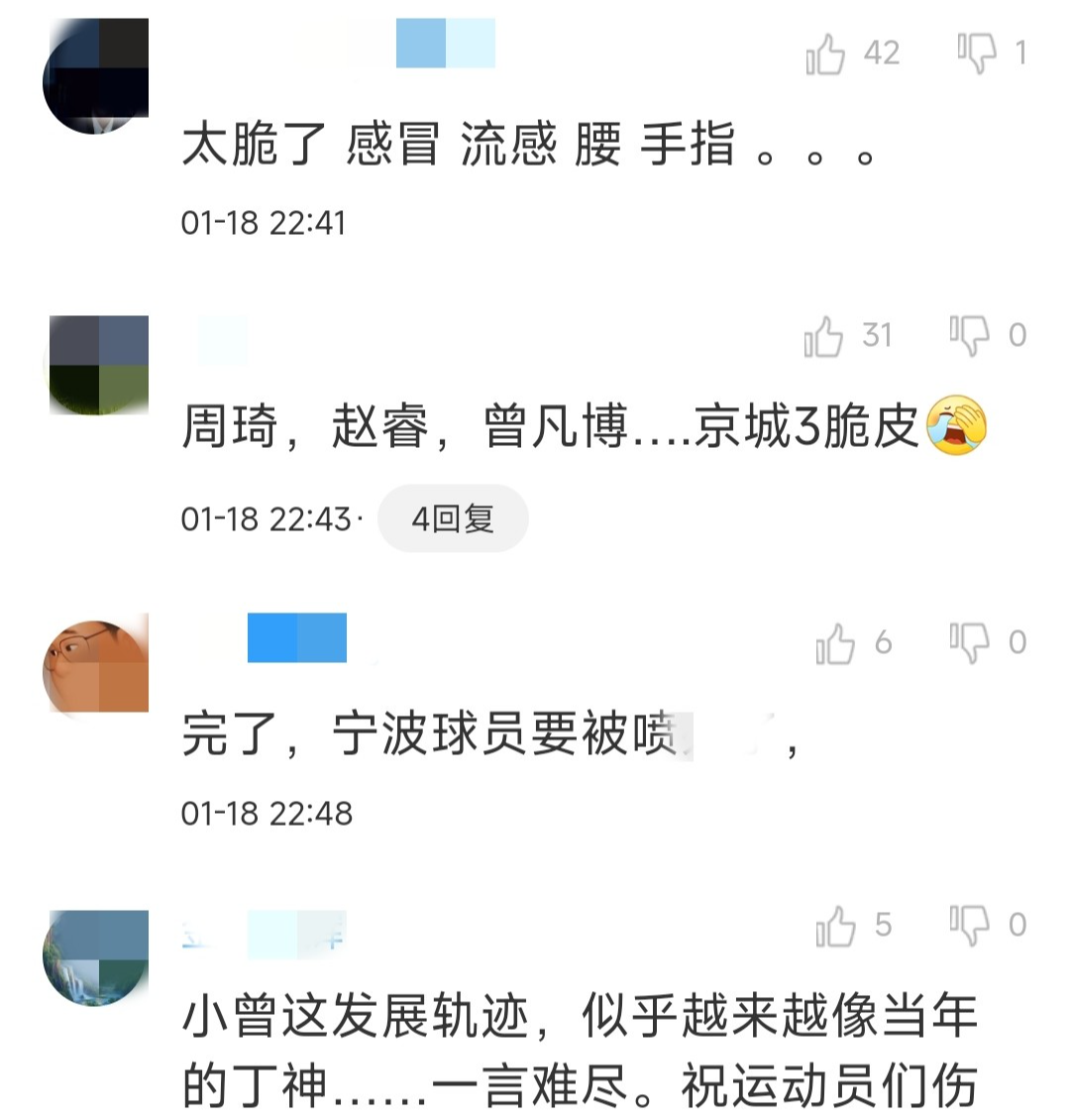 曾凡博再度受伤引发网友热议,有网友表示,小曾的发展轨迹,似乎越来越像当年的丁彦雨航了。还有网友提到了曾凡博近期遭遇到的一些情况,感冒、流感、腰、手指,顺带提到小曾太脆了。
