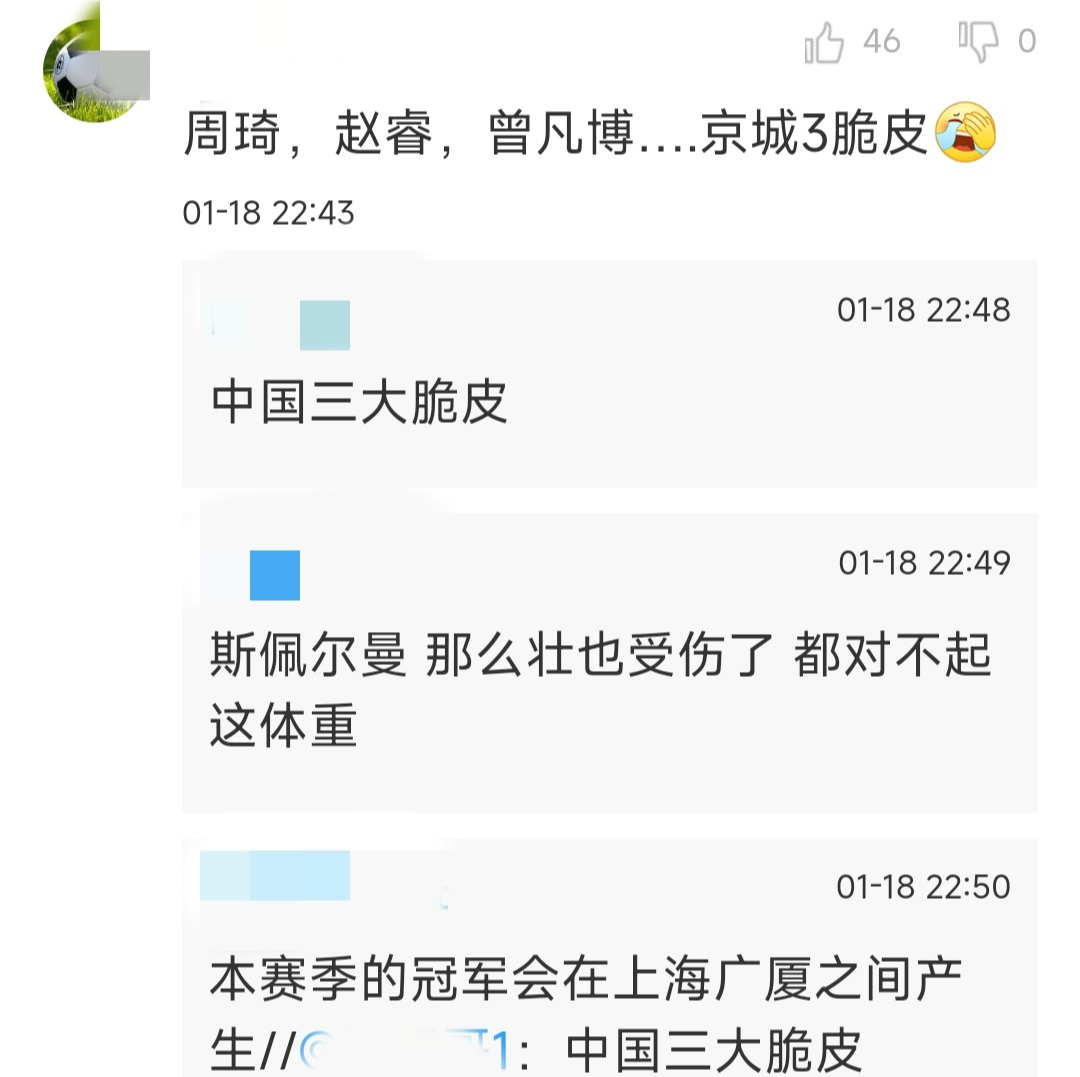 还有网友提到了曾凡博、周琦、赵睿是京城三大脆皮,下面球迷回复:中国男篮三大脆皮。首钢男篮外援斯佩尔曼也被提及,那么壮也受伤了,都对不起这体重。