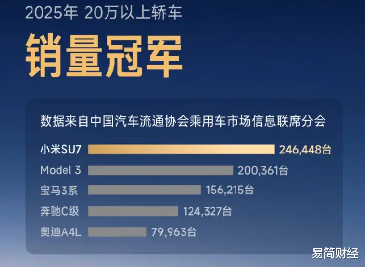但小米SU7的出现,改变了这样的局面。在竞争激烈的2025年,它成为唯一一款销量超越特斯拉Model 3的纯电轿车,销量是宝马3系的1.6倍,是奔驰C级的两倍。