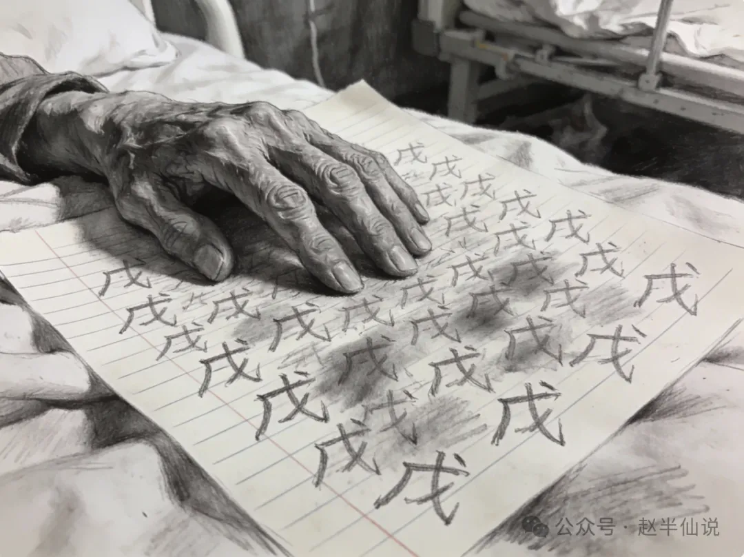 男人从怀里又掏出一张纸,轻轻放在桌上。是张普通的练习纸,上面用铅笔歪歪扭扭地画满了“戊”字——成百上千个,有的大,有的小,有的压着叠着,密密麻麻,像一窝挣不出、逃不掉的虫,透着股绝望的执念。