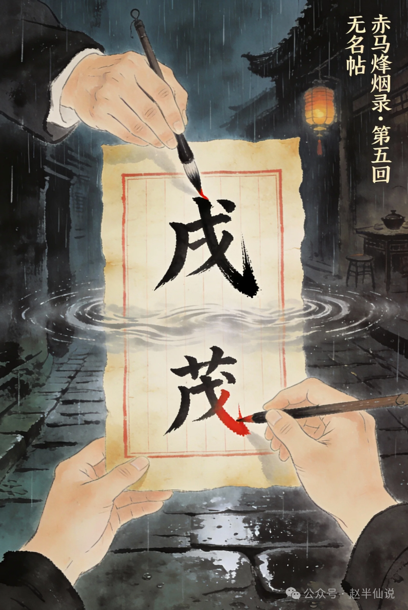 “解,要解在三处。”我回身,蘸了点茶水在桌面写,“第一,解字债。这张拜帖,不能烧,也不能留。明日辰时,你带着它去城南清水河,找处有杨柳垂岸的地方,把帖子展开放进河里,让它顺水流走。放之前,用朱砂笔在‘戊’字旁边,补写一个正确的‘茂’字。写时,诚心念三遍:‘墨误四十载,今朝水洗净。’”