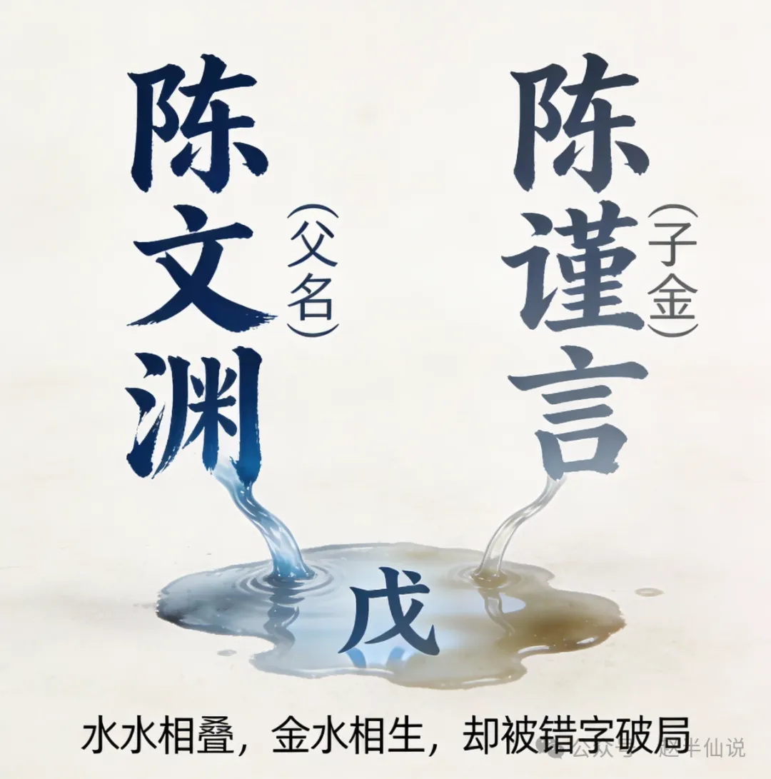 “你父亲叫陈文渊,‘文’为水,‘渊’为深水,是两重水。你的名字‘谨言’,‘言’为金,金能生水。”我指尖点在桌上,“这是你父亲在给你补水,补他自己命里缺的水。”