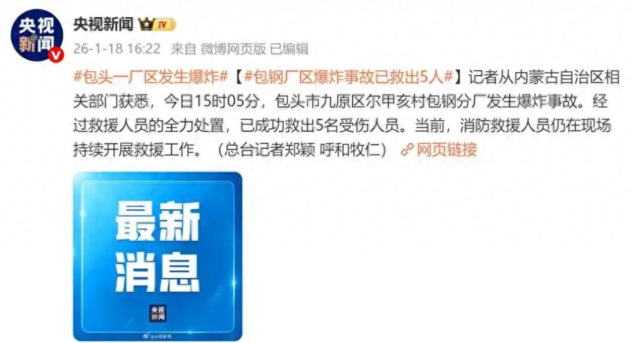 1月18日14时许,内蒙古包钢集团稀土钢板材公司突发爆炸事故。现场视频显示火光冲天,伴随巨大声响,蘑菇状烟云升腾至高空。据包头市应急管理局通报,事故造成5人失联、60余人受伤送医。包钢医院及包头市中心医院已启动应急预案,全力救治伤员。