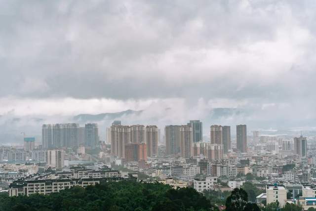 此时的窗外薄雾斜雨悄然而至,一望无边。站在书吧外围的天台旁打卡,将整个城市尽收眼底。