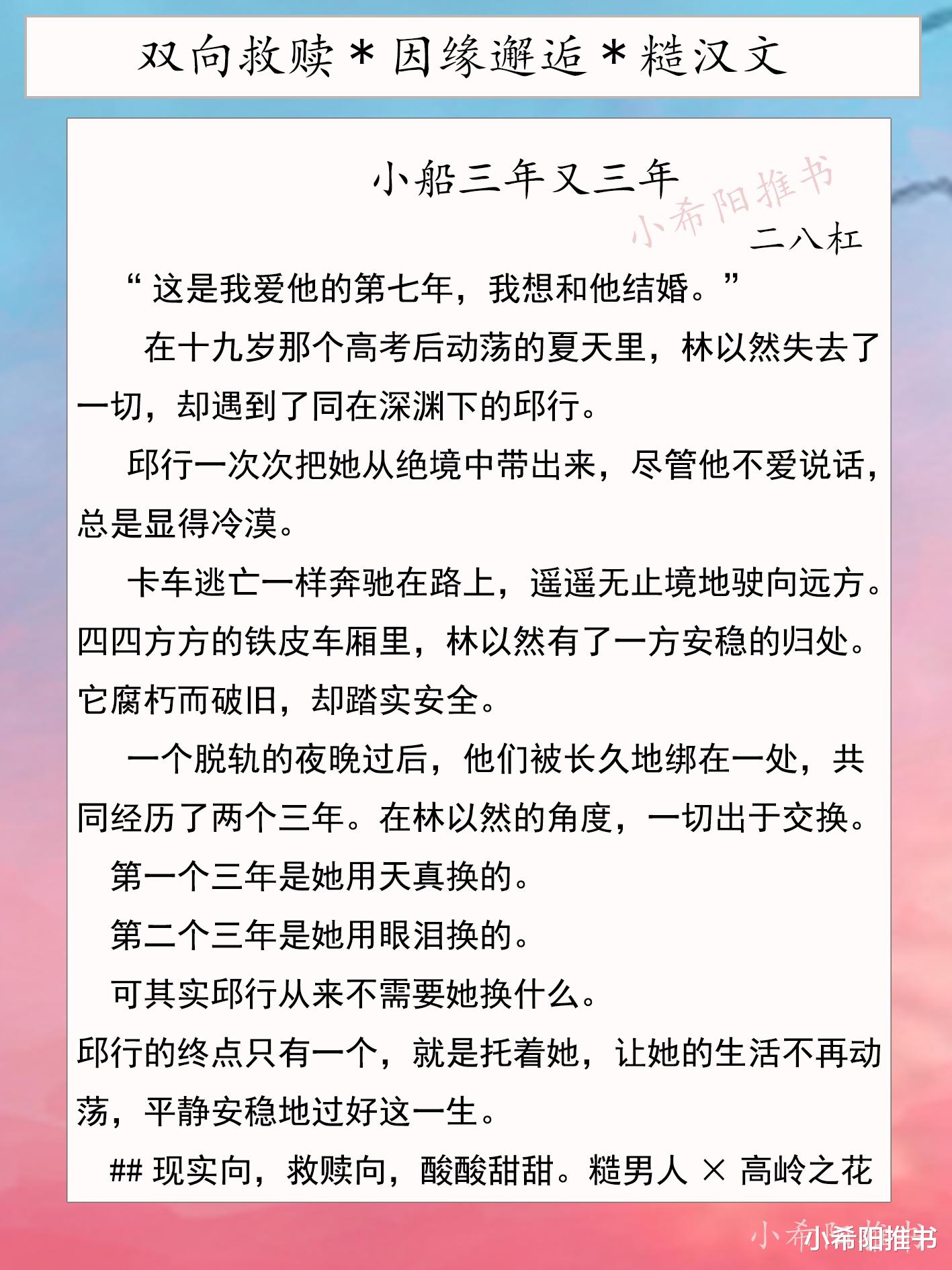 《小船三年又三年》,这是一本现实向双向救赎文,两人相差两岁,两个小苦瓜互相依靠互相成长文。
