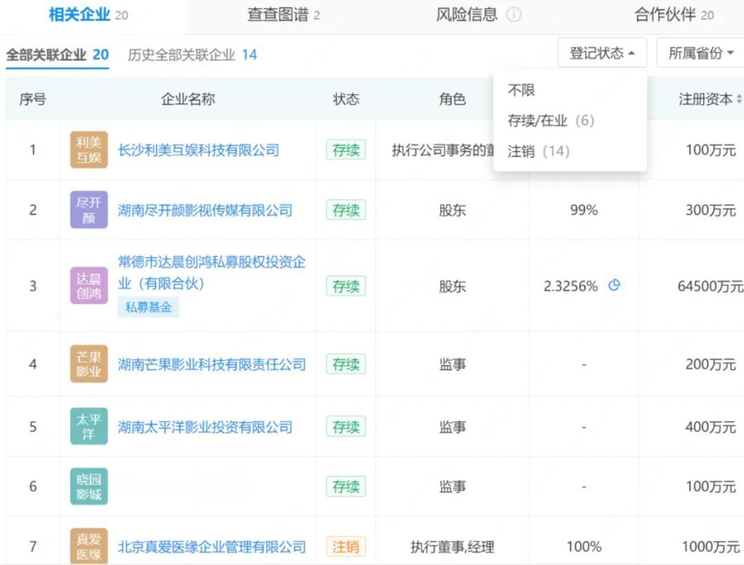 据悉,李湘所关联的企业有20家,但14家都已注销,存续的企业只剩下6家。有意思的是,在2025年8月份,李湘居然和前夫哥王岳伦合资成立湖南尽开颜影视传媒有限公司,由李湘持股99%、王岳伦持股1%并担任法定代表人职务。