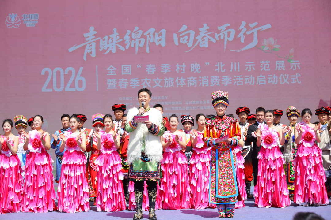鼓乐震天,羌歌飞扬。3月31日上午,四川绵阳北川桂溪镇九皇山丰收广场人声鼎沸、喜气融融,身着绚丽羌族服饰的群众载歌载舞,四方游客欢聚一堂,“青睐绵阳·向春而行”2026年全国“春季村晚”北川示范展示暨春季农文旅体商消费季正式开幕。本次活动由四川省文化和旅游厅指导,绵阳市文化广播电视和旅游局、北川羌族自治县人民政府主办,九皇山景区作为示范展示点,以优质的场地保障和浓厚的羌文化氛围,助力活动顺利举办,成为展示北川文旅魅力、推动文旅融合的重要窗口。