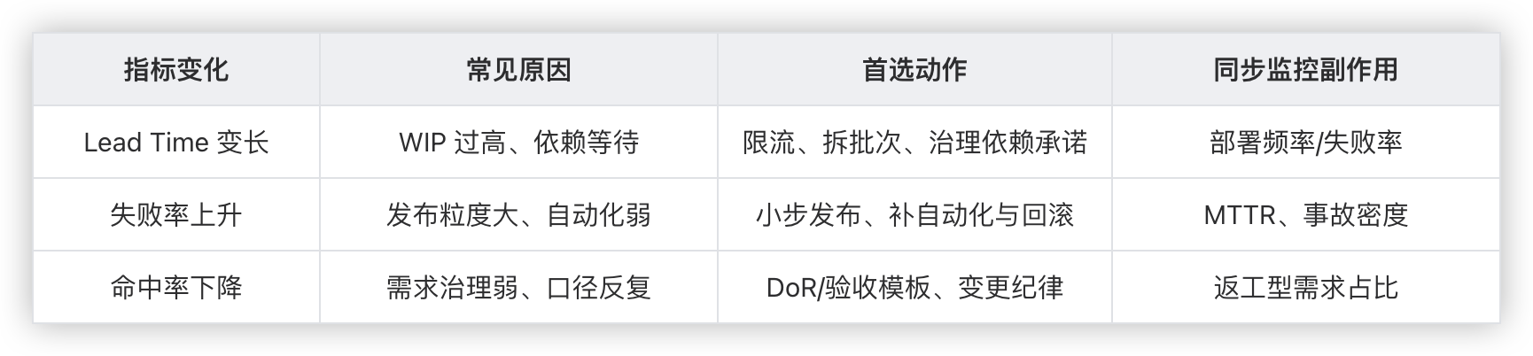 变更失败率上升 → 不要只“加审批”,先补“发布粒度、自动化防线、回滚与可观测性”。(流程加摩擦只能短期止血,能力建设才可持续。)