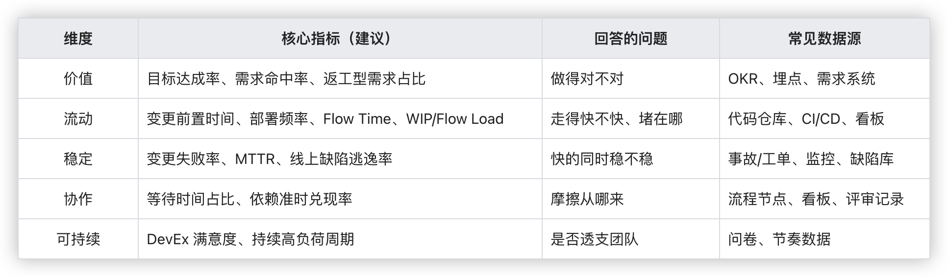 最稳妥的指标体系,是一张能驱动治理动作的仪表盘:价值 × 流动 × 稳定 × 协作 × 可持续。