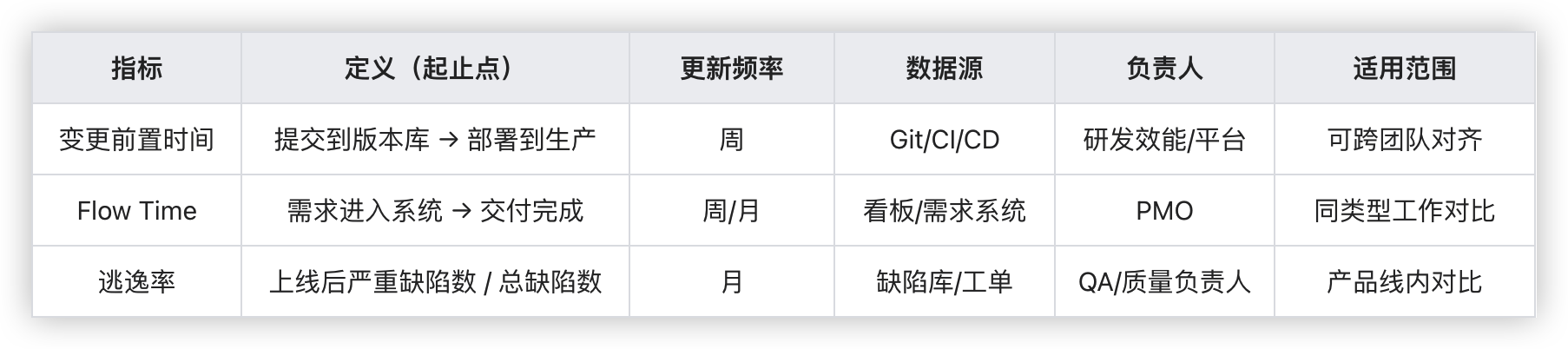 起止边界:例如 DORA 对 Lead Time 的口径明确,可作为统一标准,避免各团队自说自话。