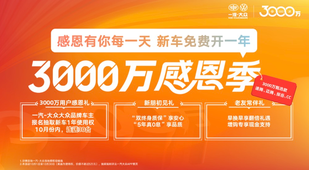 从第一辆车到第3000万辆,一汽-大众用34年的时间完成了许多同行难以企及的目标。2025年10月,这家车企即将迎来自己的又一座丰碑。为了答谢一路相伴的3000万用户,一汽-大众大众品牌策划了“3000万感恩季”活动,激发了广泛的社会关注。据统计,已有超过13万车主踊跃报名,每天都会产生一名“幸运星”车主,获得速腾L、迈腾等五款车型的一年使用权。这场活动不仅体现了品牌的亲和力,也反映了其在智能化、电动化转型中的坚定步伐。