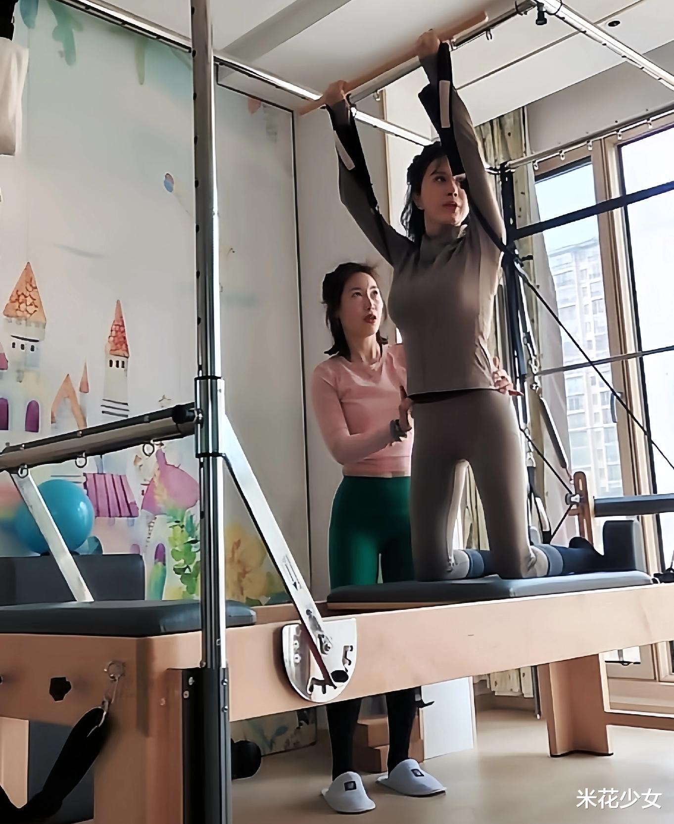 金巧巧在私教的指导下,耐心地做着拉伸动作。