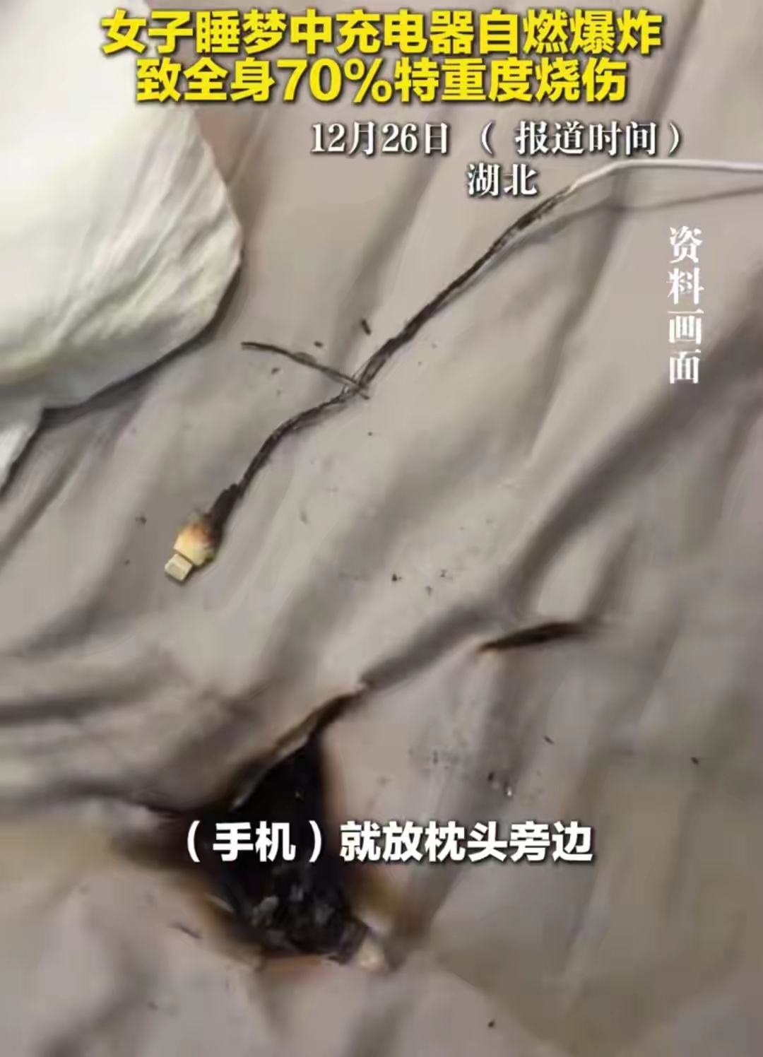 直到2025年12月25日晚上。她照常把手机插上充电器,放在枕头上,睡了。凌晨一点多,充电器突然炸了。现场一片火光,床单、被子、枕头全着了。她的头发也烧着了,整个人被火包住。她疼醒了,挣扎着爬下床跑出去求救。