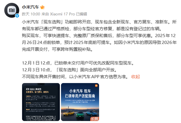 小米汽车强调,所有现车都已通过严格质检,部分车型经官方修复,均为没有登记过的车辆。现在购买现车,可享快速提车、完整原厂质保和售后,并承诺如果在2025年12月26日24点前完成锁单,有望在年底前完成提车;如果是小米汽车原因导致2026年才完成开票交付,用户将获得跨年购置税补贴。