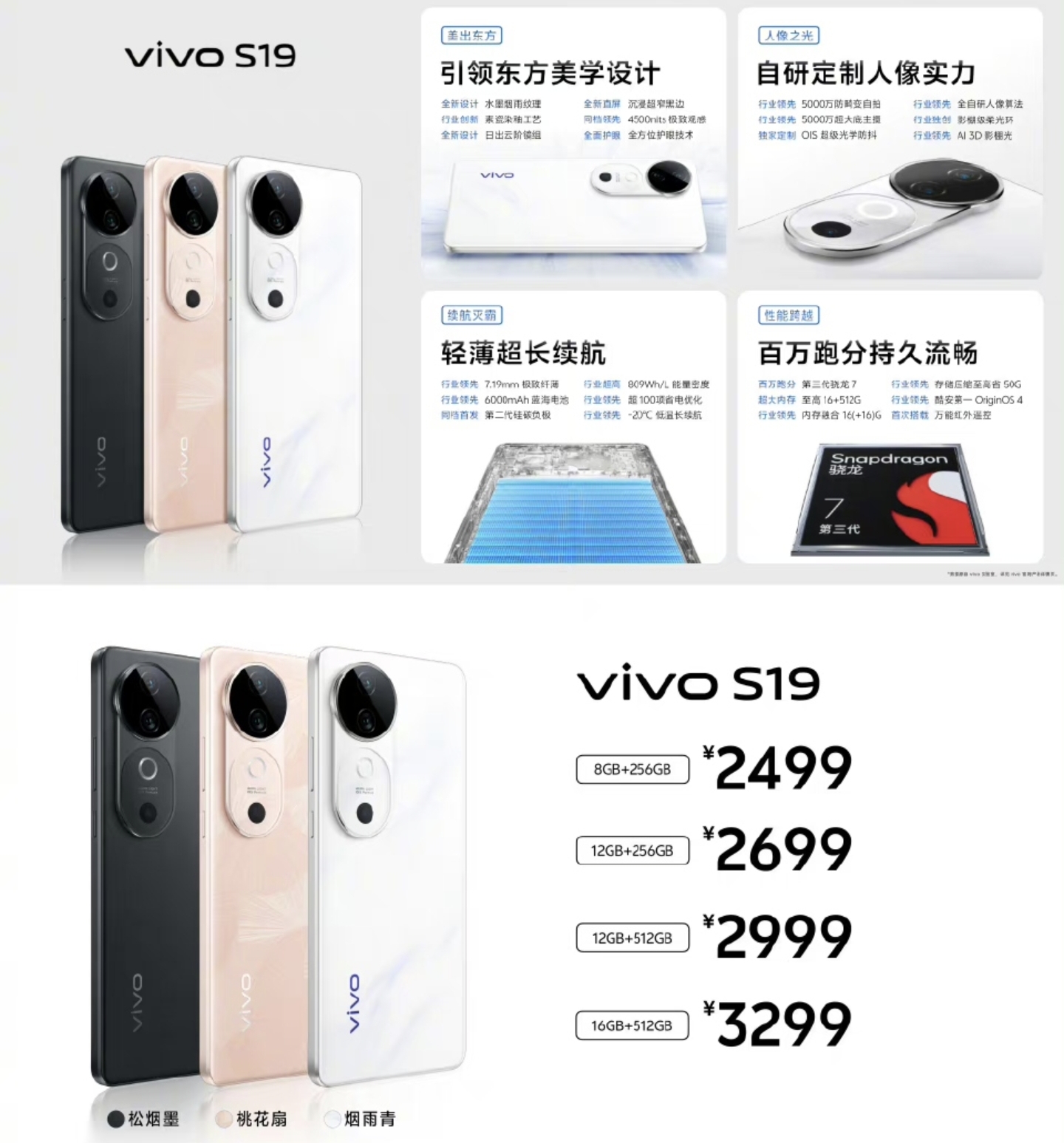 vivo S19:骁龙7G3,8+256GB/12+256GB/12+512GB/16+512GB, 80Wvivo S