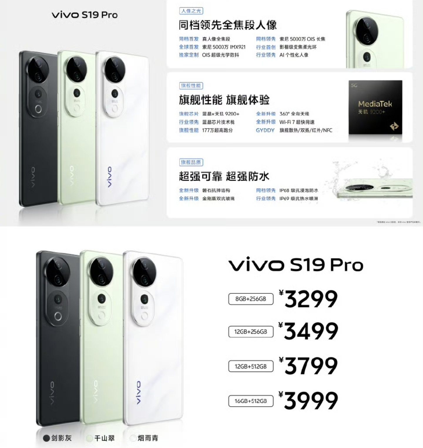 vivo S19:骁龙7G3,8+256GB/12+256GB/12+512GB/16+512GB, 80Wvivo S19 Pro:天玑9200+, 8+256GB/12+256GB/12+512GB/16+512GB, 80W标准版 6.78"1.5K OLED直屏,4500nit峰值亮度,骁龙7G3,6000mAh+80W,前置50Mp,后置50Mp GNJ 1/1.56" OIS大底主摄+8Mp超广角+柔光环,磐石抗摔结构+塑料中框+红外+NFC+IP64,7.19mm/193g